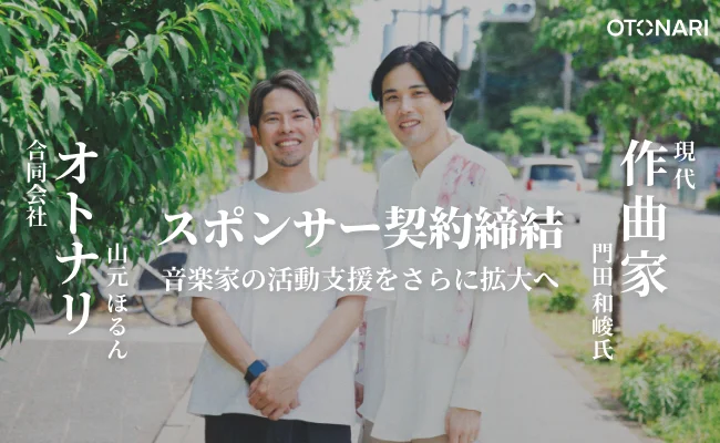 株式会社OTONARIさんとスポンサー契約を締結しました。 Concerts/Events 2025.11.16 2024.08.02 OTONARI、作曲家 門田和峻の音楽活動支援のスポンサー契約を締結合同会社オトナリのプレスリリース(2024年6月5日 15時00分)OTONARI、作曲家 門田和峻の音楽活動支援のスポンサー契約を締結