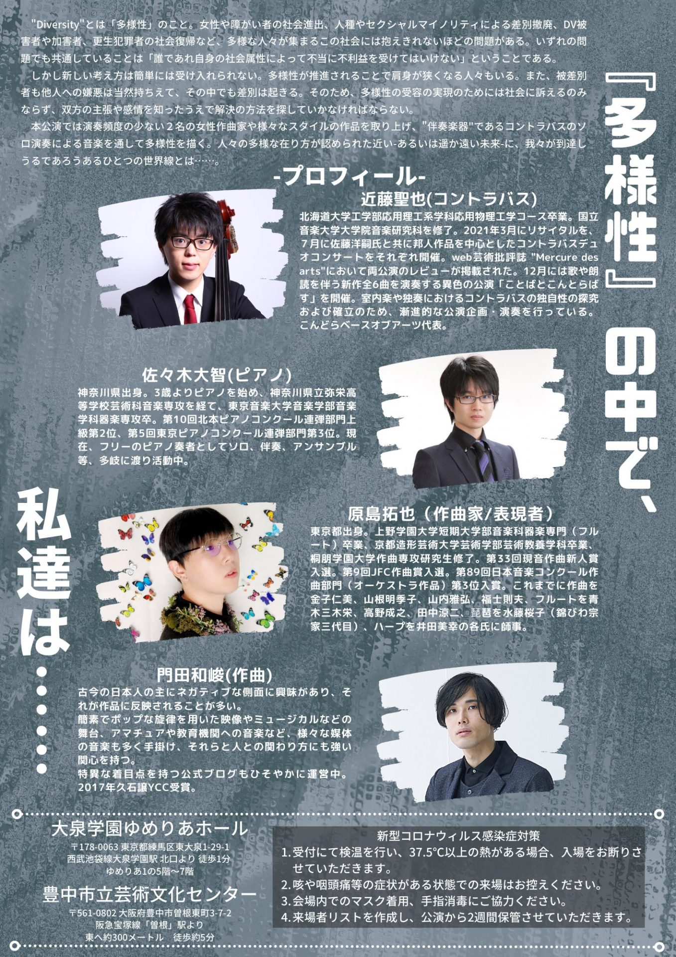 今作には楽器を回転させることによる音の指向性の変化がキモとして登場する。「歌」は受容を求め発せられるが激しく抑制され、方々に四散する。現代のヒトの歌の成れの果ての1つとして聴こえ得るだろうか。