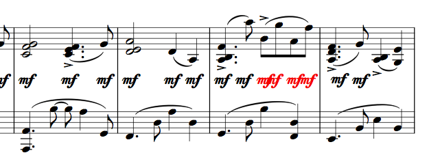 一方Sibeliusの編集画面。これは何もせずともアクセントとスラーが被ってないし、mfも1列にそろっていてとてもきれいです。(ちなみにmfが赤いのは被っていることを教えてくれる機能です。)