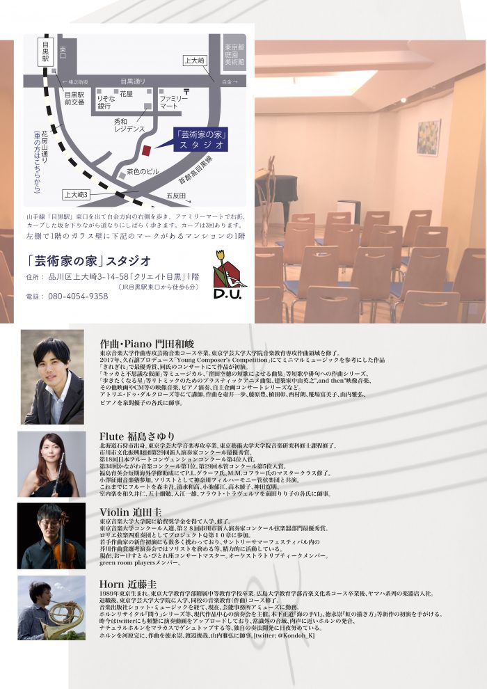 元は単純にぴらぴらとした紙の質感をイメージした曲。その後、何度か再演の機会をいただくのだが、作曲当時ついていた作曲の先生に「そういうのはピッコロとかフルートとかにやらせれば良い」と言われたことが、ずっと記憶の片隅にあった。あえてピアノでやってダサい感じにすることに意味を見出しているつもりだったが、単旋律で軽い曲調はピッコロに合いそうなことも確かで、せっかくの機会なので今回演奏をお願いした。