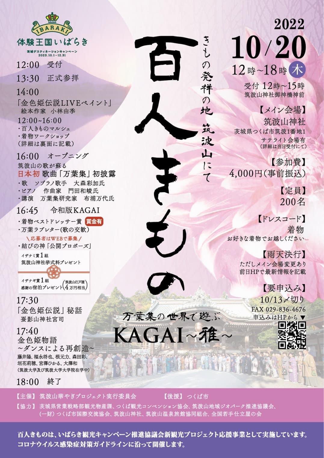 「常陸国風土記」に万葉の(かがい)の舞台、筑波山麓にはその当時、1万人もの人が集まったという史実に心動かされ、筑波山に再び1万人が集う賑わいと華やぎをもたらせたい・・・と、日本が世界に誇れる文化の象徴「着物」で集う「百人きもの」