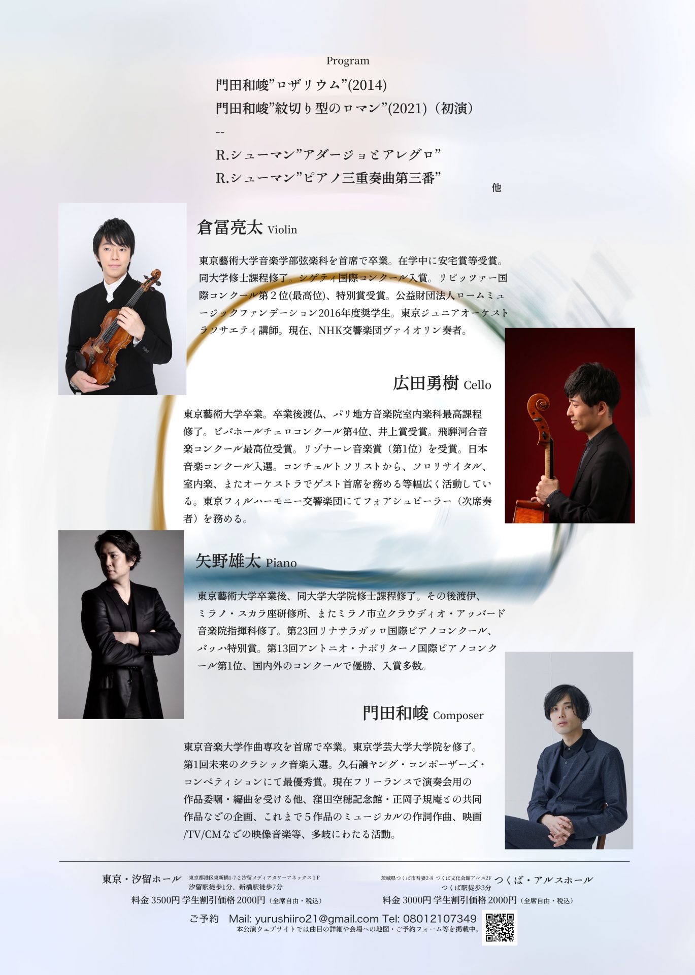 N響東フィルといった名だたるオケで活躍中の倉冨(Vn)・広田(Vc)とイタリアで研鑽を積んだ指揮者でもあり今年イタリアから帰国する矢野(Pf)によるピアノトリオと、門田の作品によるコラボレーションコンサート。