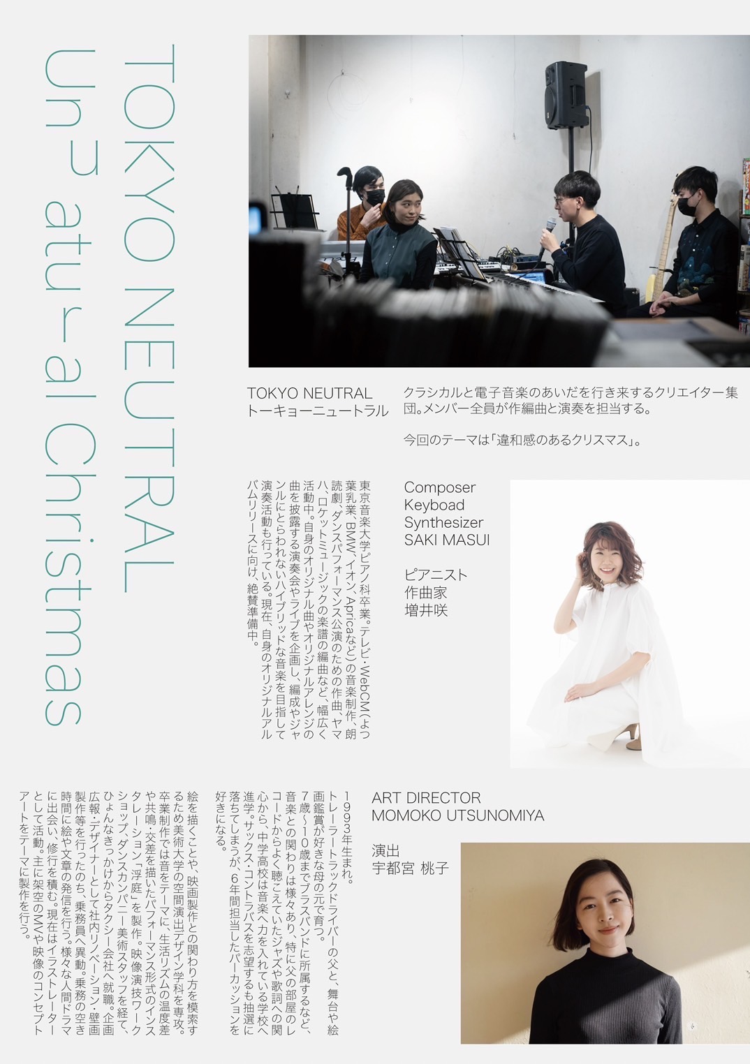 静かなポップス・風呂場跡の退廃感・クリスマスソング・電子音・コンテンポラリーなどを混ぜこぜにしたライブです。